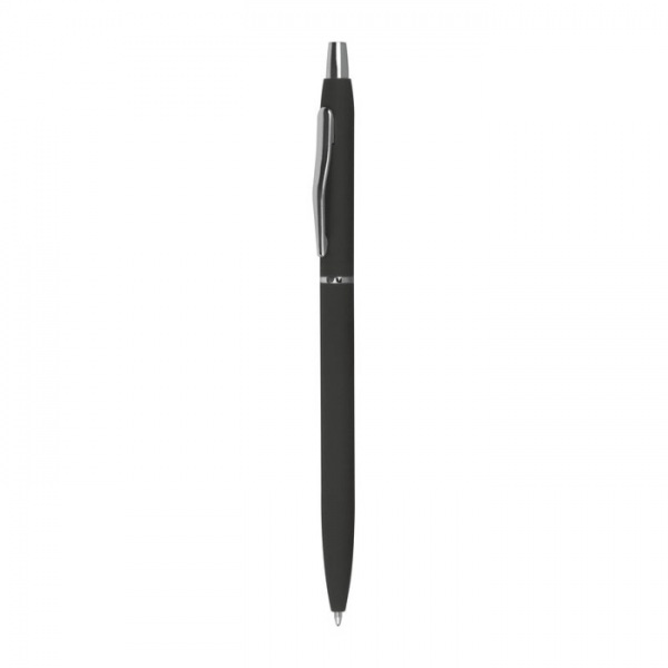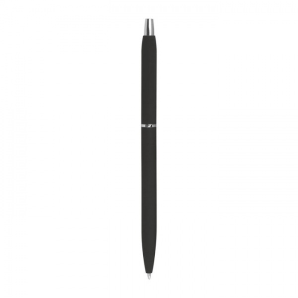 Tenké pogumované kovové guľôčkové pero so striebornými aplikáciami a čiernou náplňou.