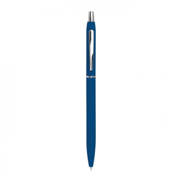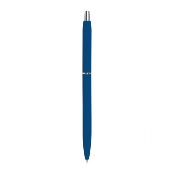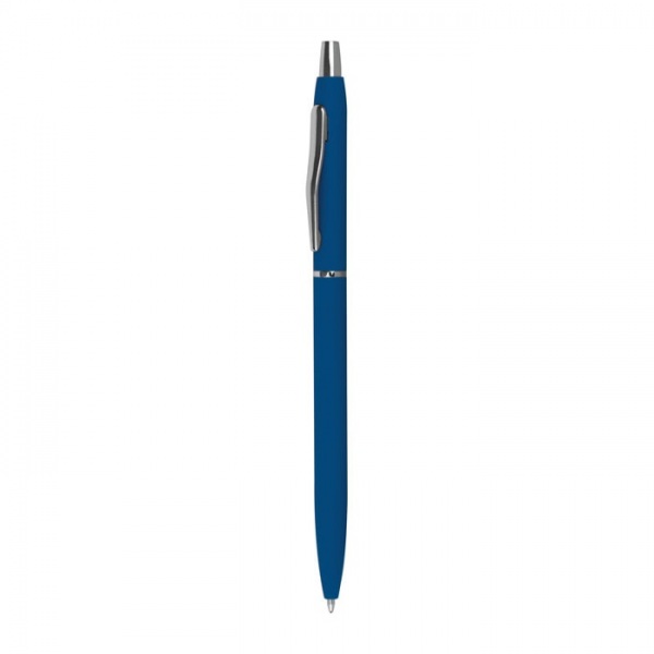 Tenké pogumované kovové guľôčkové pero so striebornými aplikáciami a čiernou náplňou.