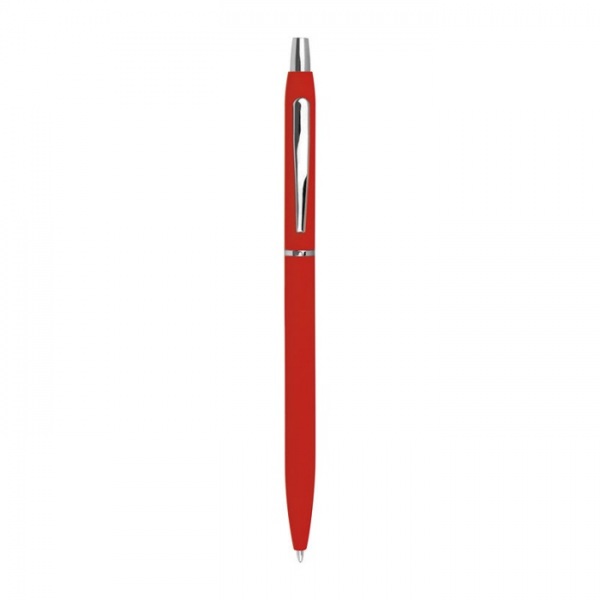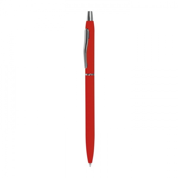 Tenké pogumované kovové guľôčkové pero so striebornými aplikáciami a čiernou náplňou.