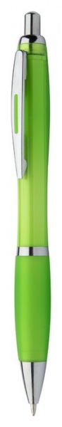 Plastové guľôčkové pero, farebné telo, gumový grip, lesklé chrómované časti. Dodáva sa s modrou náplňou.