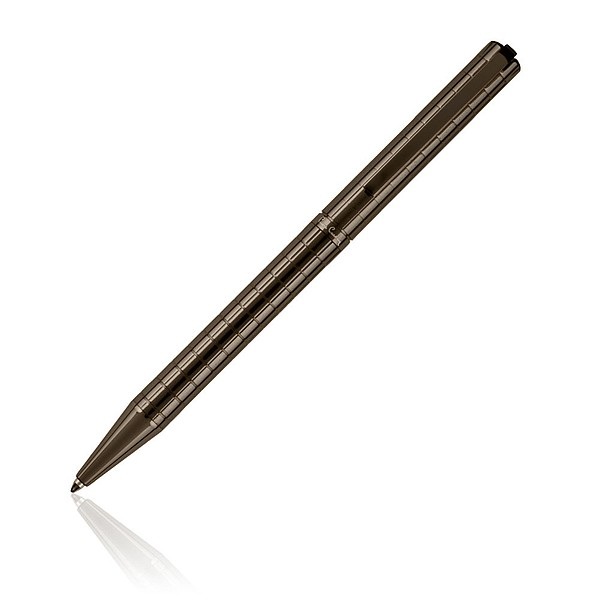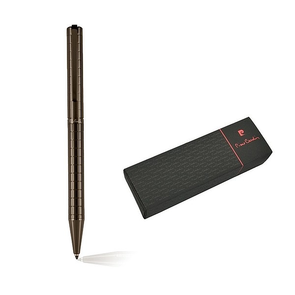 Značkové kovové guľôčkové pero Pierre Cardin s otočným mechanizmom. Telo je zdobené károvaným gravírovaním, obsahuje kvalitnú modrú náplň, hrot 1 mm a náhradnú čiernu náplň. Balené v luxusnej krabičke Pierre Cardin, dodávané s certifikátom pravosti.