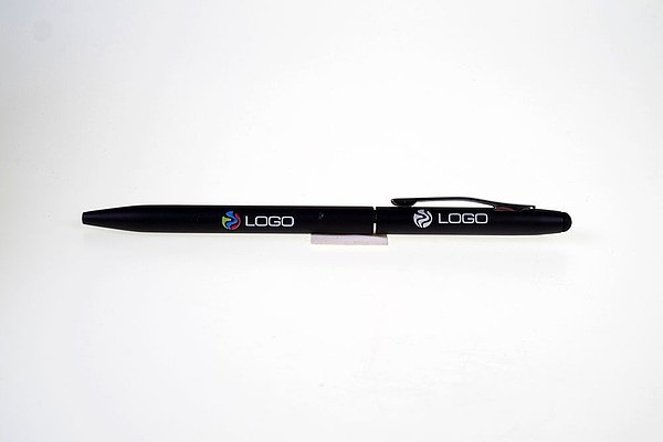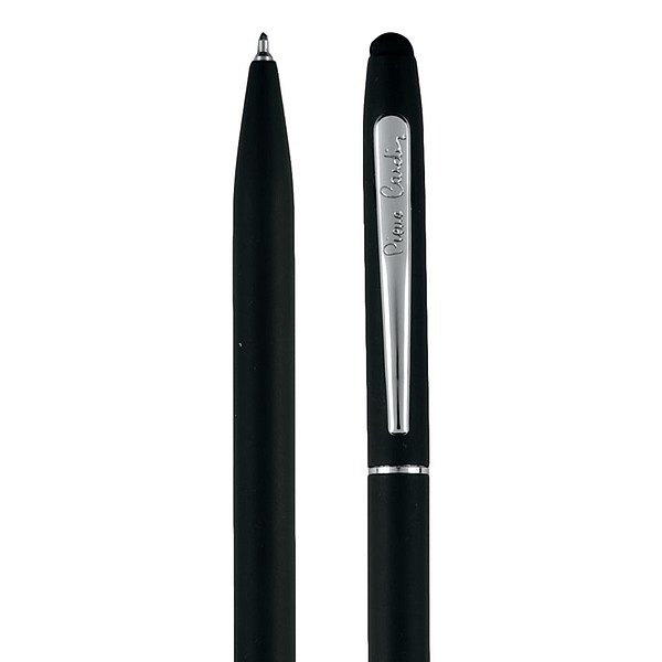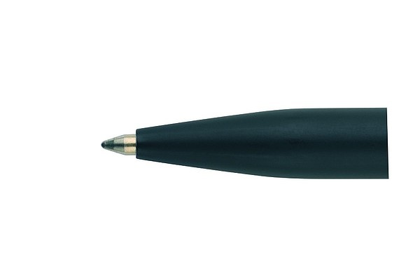 Elegantné guľôčkové pero P.Cardin s otočným mechanizmom, čiernej matnej kovové telo so strieborným klipom a stylusom, obsahuje kvalitnú modrú náplň s hrotom 0,7 mm. Balené v luxusnej vrecku P.Cardin, dodávané s certifikátom pravosti.