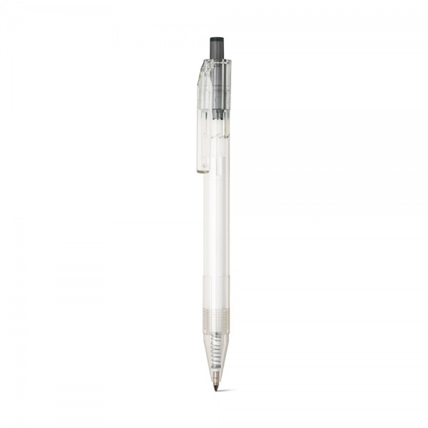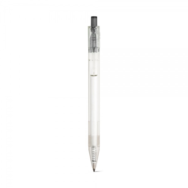 Guľôčkové pero z priehľadného recyklovaného PET materiálu s farebným gombíkom. Čierny atrament.?11 x 142 mm