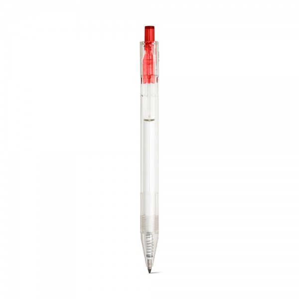 Guľôčkové pero z priehľadného recyklovaného PET materiálu s farebným gombíkom. Čierny atrament.?11 x 142 mm