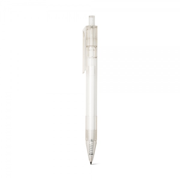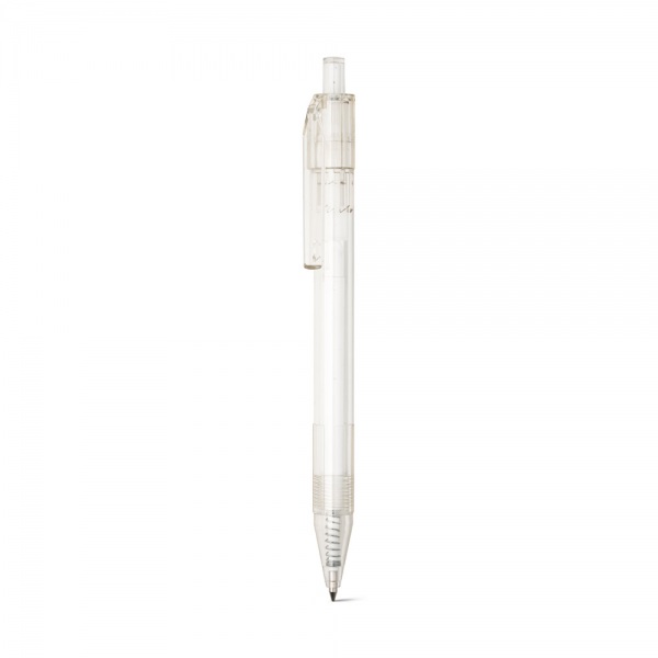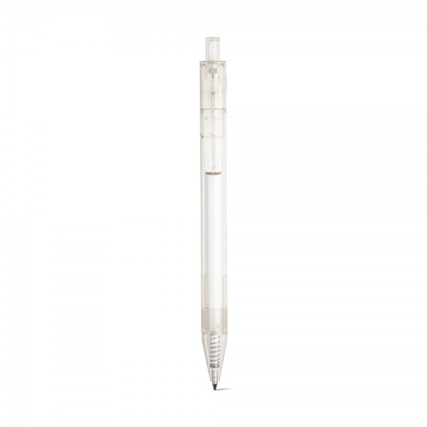 Guľôčkové pero z priehľadného recyklovaného PET materiálu s farebným gombíkom. Čierny atrament.?11 x 142 mm