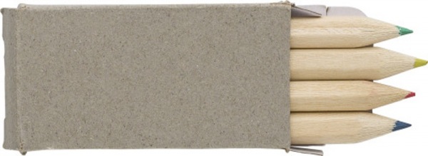 Drevená mini súprava ceruziek so 4 ceruzkami (žltá, červená, zelená, modrá) v recyklovateľnej krabičke.