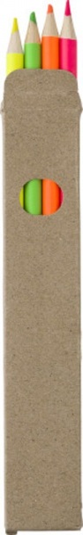 Drevená súprava zvýrazňovačov so 4 farebnými ceruzkami (žltá, oranžová, ružová a zelená) v papierovej krabičke.