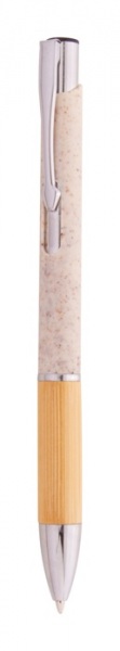 Ekologické plastové guľôčkové pero z pšeničnej slamy s bambusovým úchopom a kovovými časťami. S modrou náplňou.