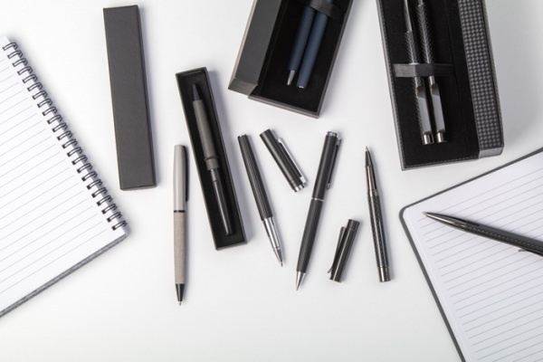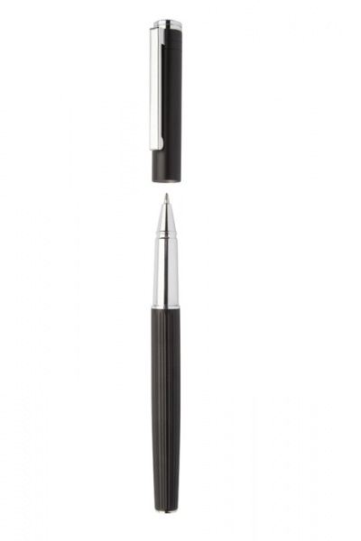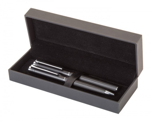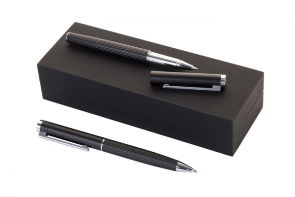 Elegantná sada hliníkového guľôčkového pera a rollera s prúžkovaným tubusom. V čiernej darčekovej krabičke. S modrou náplňou.