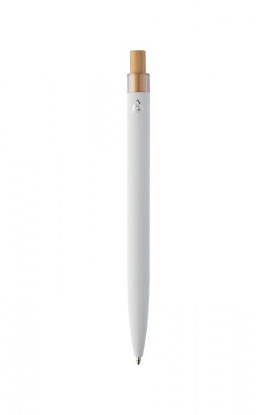 Guľôčkové pero z recyklovaného hliníka s pogumovaným povrchom, bambusovým tlačidlom a chrómovým klipom. So špeciálnou vrstvou na zrkadlové laserové gravírovanie. S modrou náplňou.