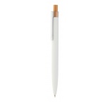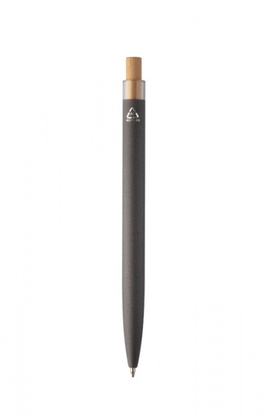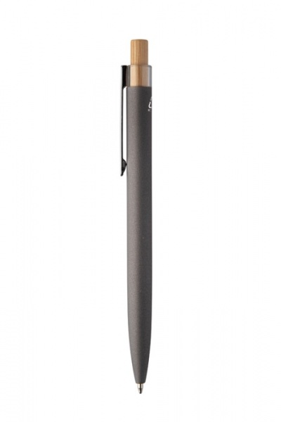 Guľôčkové pero z recyklovaného hliníka s pogumovaným povrchom, bambusovým tlačidlom a chrómovým klipom. So špeciálnou vrstvou na zrkadlové laserové gravírovanie. S modrou náplňou.
