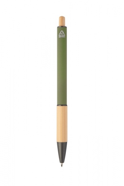 Guľôčkové pero z recyklovaného hliníka s bambusovým úchopom a tlačidlom, pogumovaným telom a kovovými časťami. S modrou náplňou.