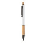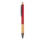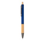 Guľôčkové pero z recyklovaného hliníka s bambusovým úchopom a tlačidlom, pogumovaným telom a kovovými časťami. S modrou náplňou.