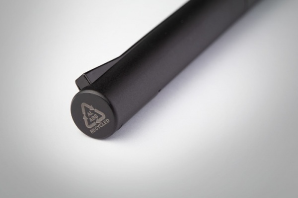 Guľôčkové pero z recyklovaného hliníka s matnou metalickou povrchovou úpravou. Horná časť z recyklovaného ABS. S modrou náplňou.