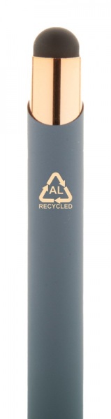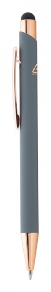 Guľôčkové a dotykové pero z recyklovaného hliníka s pogumovaným povrchom a detailmi vo farbe ružového zlata. So špeciálnou povrchovou úpravou na zrkadlové laserové gravírovanie vo farbe ružového zlata. S modrou náplňou.