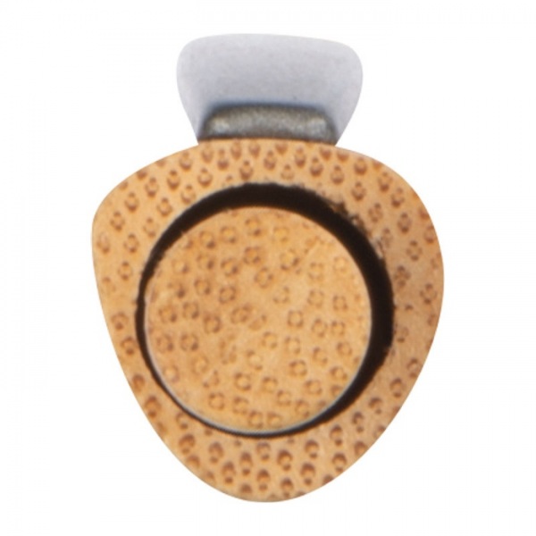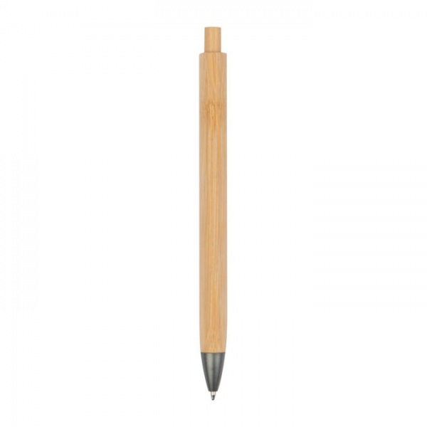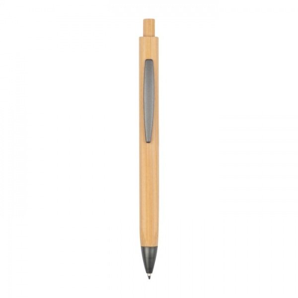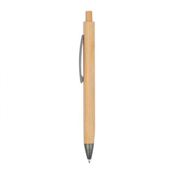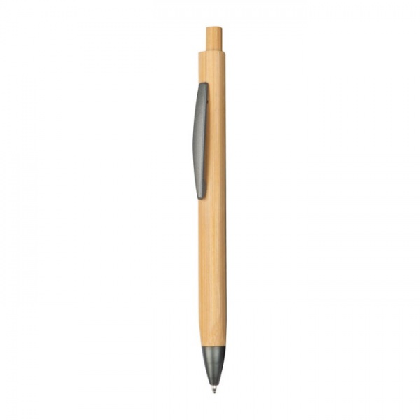 Trojuholníkový tvar bambusového guľôčkového pera s modrou náplňou a kovovým klipom uľahčuje držanie.