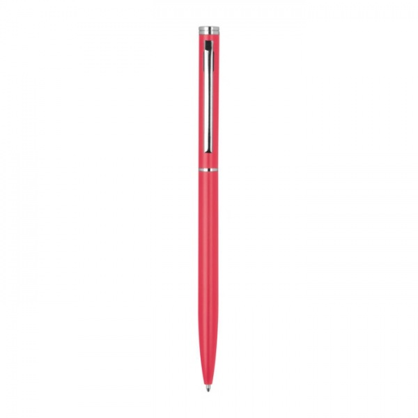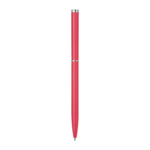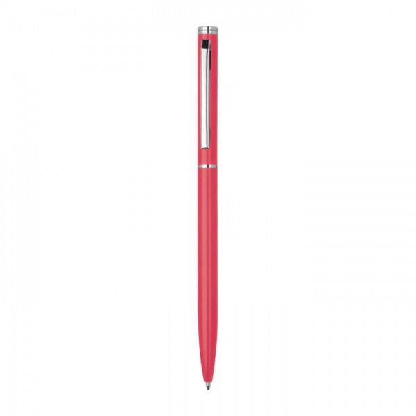 Elegantné kovové guľôčkové pero s modrou náplňou a pochrómovaným klipom.