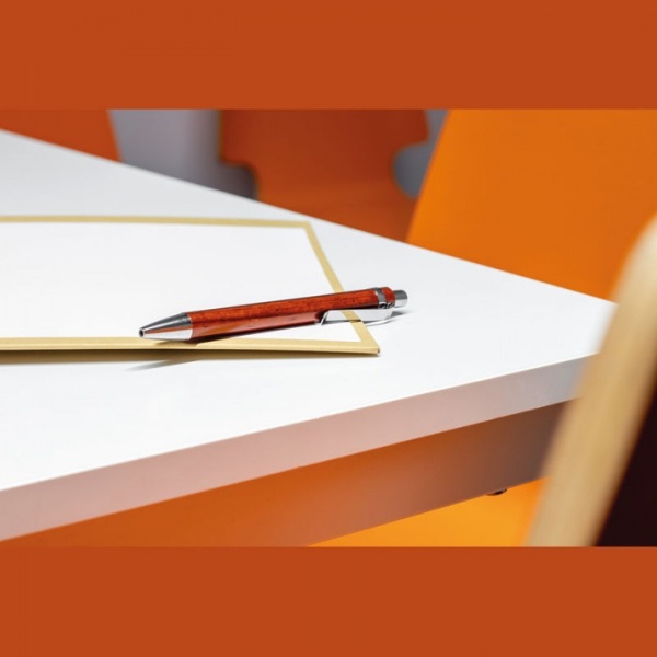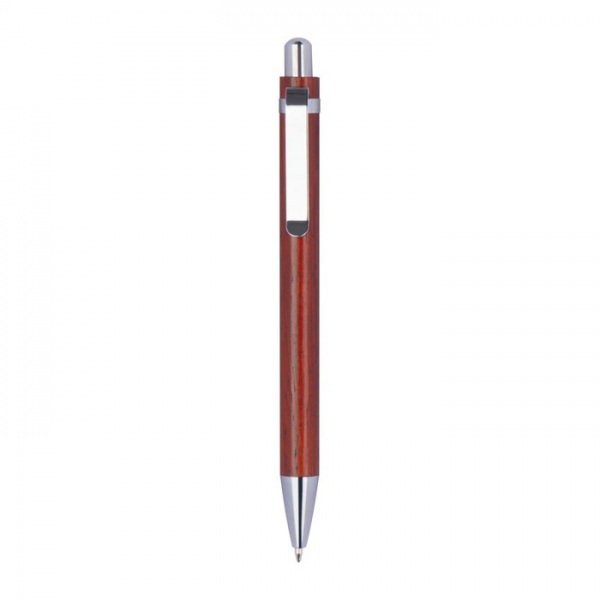 Guľôčkové pero z lakovaného dreva s modrou náplňou a so striebornými aplikáciami.