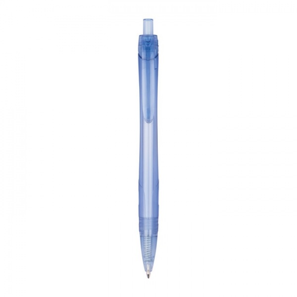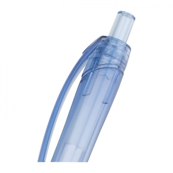 Ekologické, transparentné guľôčkové pero z RPET s veľkou modrou náplňou, zakriveným klipom, mierne odsadenou zónou úchopu a logom RPET.