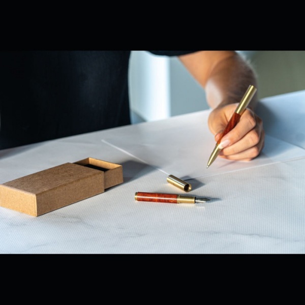 Mini kovová sada na písanie pozostávajúca z plniaceho pera a rollera. Pre pohodlné písanie je možné vrchnák naskrutkovať na zadnú časť pera. Balené ekologicky v kartónovej krabičke.