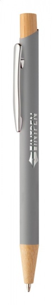 Guľôčkové pero z recyklovaného hliníka s bambusovými časťami, pogumovaným povrchom a chrómovým klipom. So špeciálnou vrstvou na zrkadlové laserové gravírovanie. S modrou náplňou.