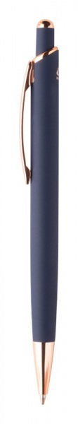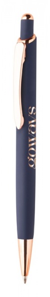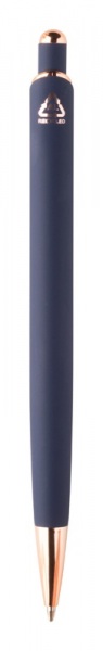 Guľôčkové pero z recyklovaného hliníka s pogumovaným povrchom a detaily z ružového zlata. So špeciálnou povrchovou úpravou na zrkadlové laserové gravírovanie vo farbe ružového zlata. S modrou náplňou.