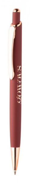 Guľôčkové pero z recyklovaného hliníka s pogumovaným povrchom a detaily z ružového zlata. So špeciálnou povrchovou úpravou na zrkadlové laserové gravírovanie vo farbe ružového zlata. S modrou náplňou.