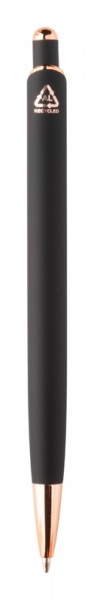 Guľôčkové pero z recyklovaného hliníka s pogumovaným povrchom a detaily z ružového zlata. So špeciálnou povrchovou úpravou na zrkadlové laserové gravírovanie vo farbe ružového zlata. S modrou náplňou.