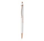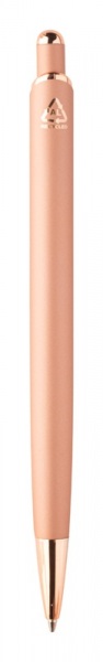 Guľôčkové pero z recyklovaného hliníka s pogumovaným povrchom a detaily z ružového zlata. So špeciálnou povrchovou úpravou na zrkadlové laserové gravírovanie vo farbe ružového zlata. S modrou náplňou.