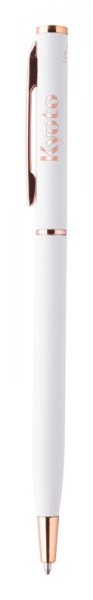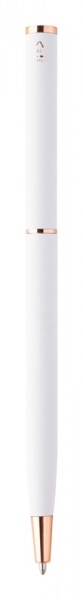 Guľôčkové pero z recyklovaného hliníka s pogumovaným povrchom a detailmi z ružového zlata. So špeciálnou povrchovou úpravou pre zrkadlové laserové gravírovanie vo farbe ružového zlata.