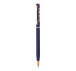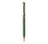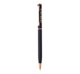 Guľôčkové pero z recyklovaného hliníka s pogumovaným povrchom a detailmi z ružového zlata. So špeciálnou povrchovou úpravou pre zrkadlové laserové gravírovanie vo farbe ružového zlata.