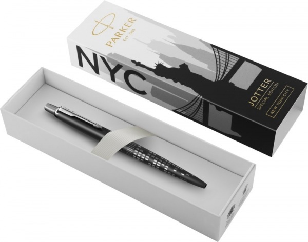 Guľôčkové pero s modrým atramentom Parker Jotter SE Global Icons dodávané v darčekovej krabičke. „SE“ označuje „Špeciálne vydanie“ a motív „Global Icons“ naznačuje vzhľad, ktorý oslavuje kultové prvky z celého sveta. Dĺžka písania: 2 000 metrov.