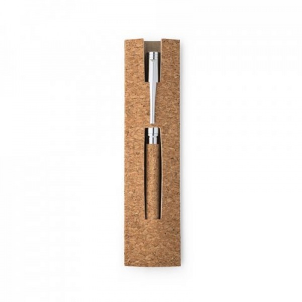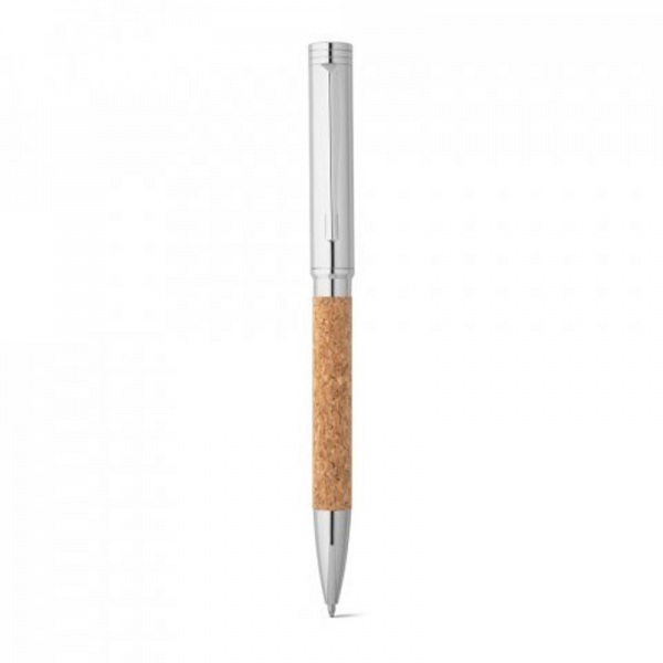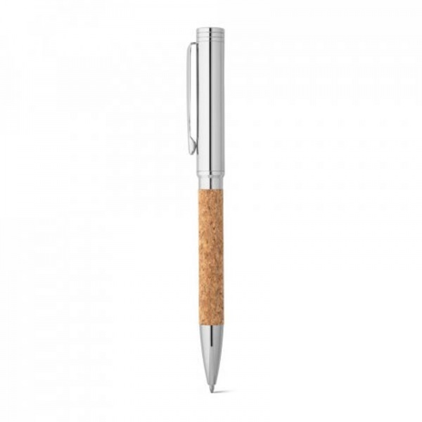 Guľôčkové pero s korkovým a kovovým telom s klipom. Guľôčkové pero má modrú náplň a otočný mechanizmus. Dodáva sa v korkovom darčekovom vrecúšku.