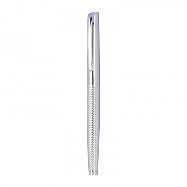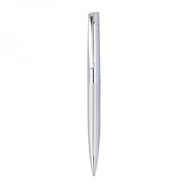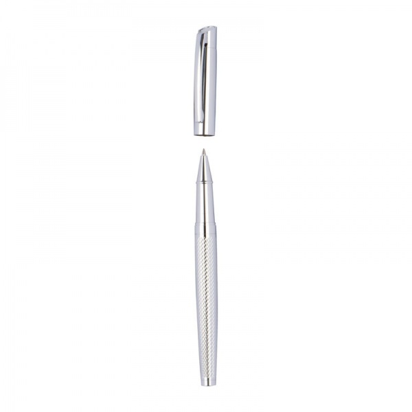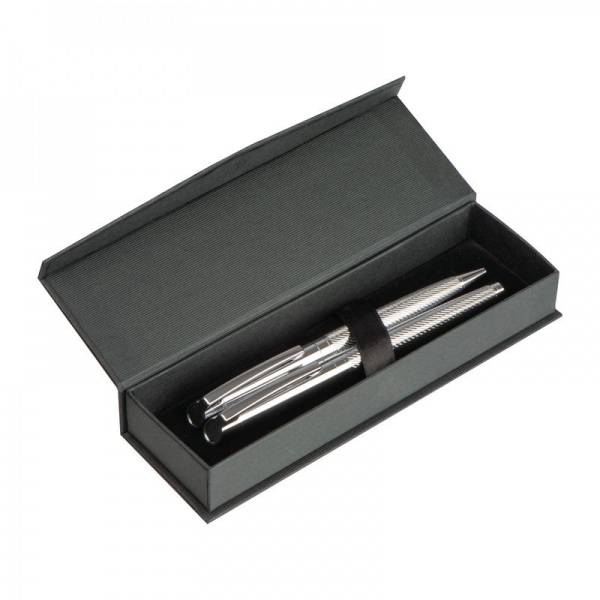 Sada písacích potrieb pozostávajúca z guľôčkového pera a rolleru vyrobených z lesklého chrómu v čiernom darčekovom balení. Obe perá majú modrú náplň.