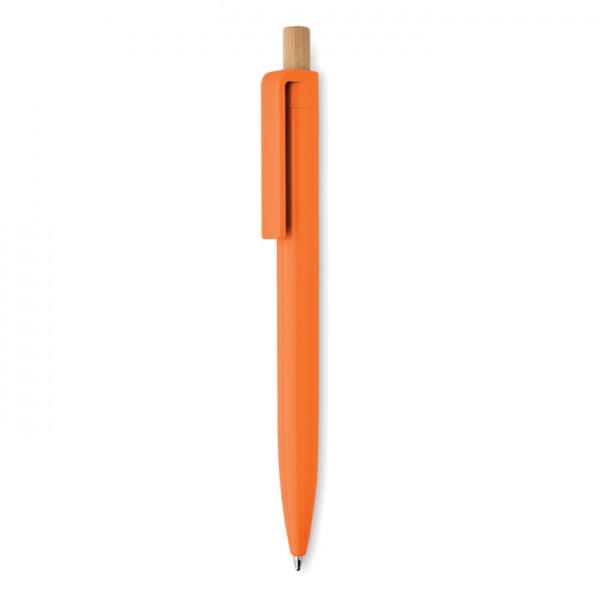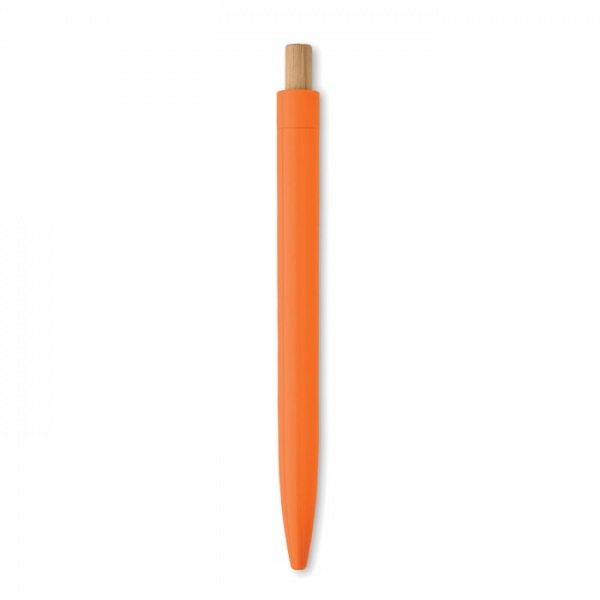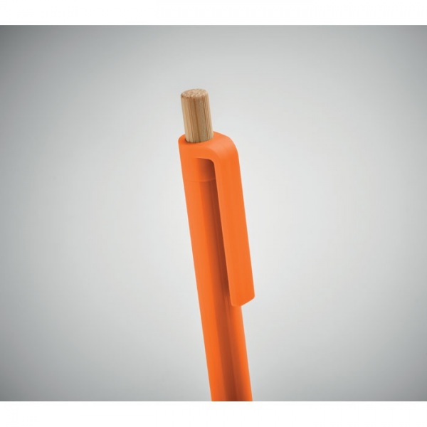 Guľôčkové pero z recyklovaného ABS s bambusovým tlačidlom. Modrá náplň.