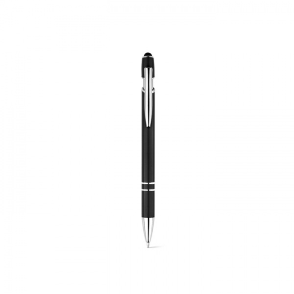 Guľôčkové pero z recyklovaného hliníka (100%) s dotykovým hrotom v hornej časti pera. Modrá náplň.