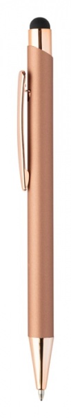Guľôčkové a dotykové pero z recyklovaného hliníka s pogumovaným povrchom a detailmi vo farbe ružového zlata. So špeciálnou povrchovou úpravou na zrkadlové laserové gravírovanie vo farbe ružového zlata. S modrou náplňou.