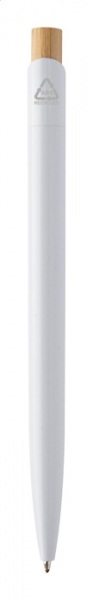 Guľôčkové pero z recyklovaného ABS plastu s bambusovým tlačidlom. S modrou náplňou.