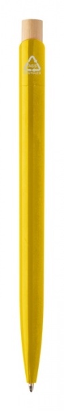 Guľôčkové pero z recyklovaného ABS plastu s bambusovým tlačidlom. S modrou náplňou.