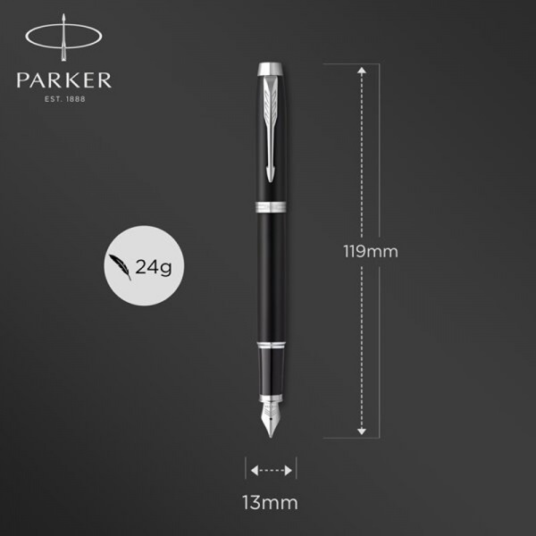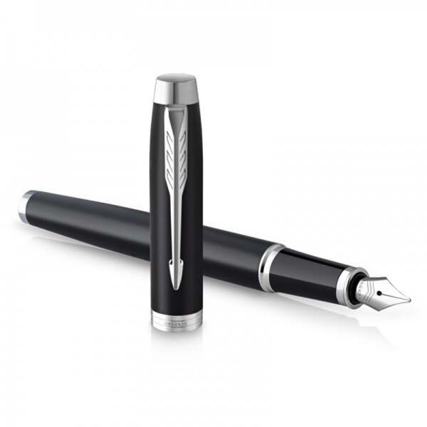 Čierne plniace pero Parker IM Essential má mosadzné telo a vrchnák s matnou lakovanou povrchovou úpravou. V kombinácií s doplnkami pokovovanými chrómom. Hrot z nerez ocele je zdobený jemnou rytinou. Modrá bombička.