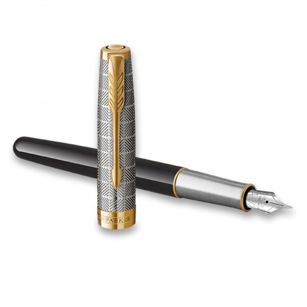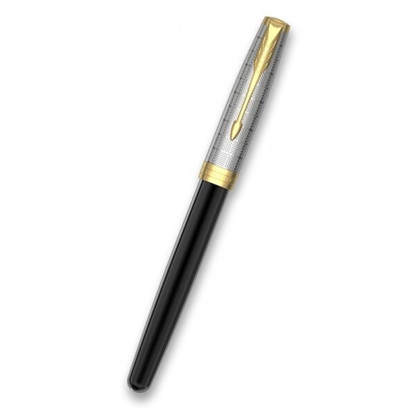 Čierne lakované telo a vrchnák z leštenej nerez ocele so zdobeným vzorom vytvoreným leptaním. V kombinácii s pozlátenými doplnkami. Hrot z 18karátového zlata (rýdzosť Au 750/1000) s krížovou rytinou, pokovovaný ródiom. 2 čierne bombičky.