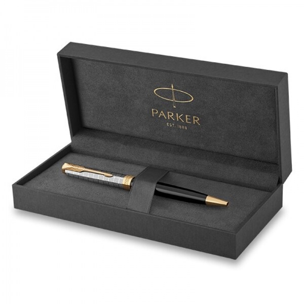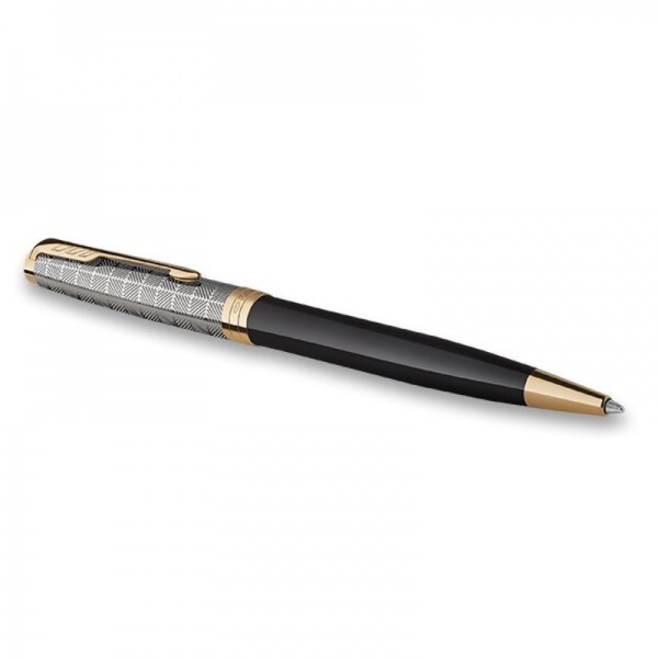 Čierne lakované telo a vrchná časť z leštenej nerez ocele so zdobeným vzorom vytvoreným leptaním. V kombinácii s pozlátenými doplnkami. Čierna náplň.