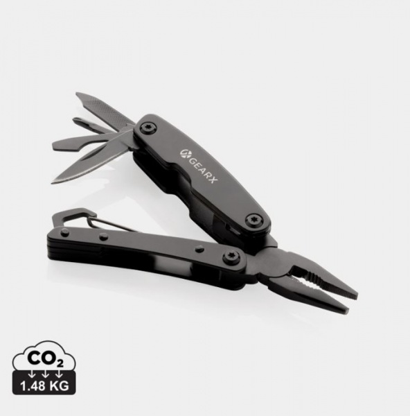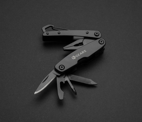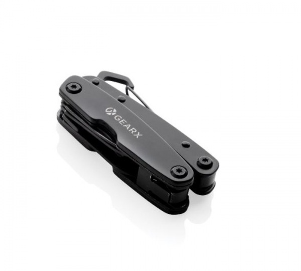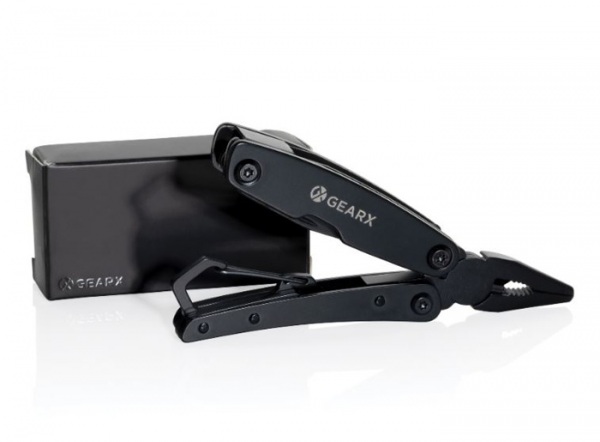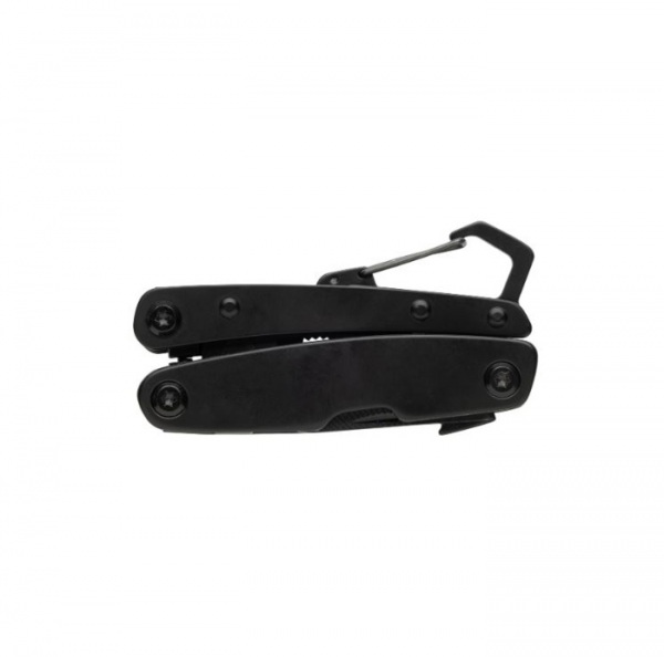 Vreckové multifunkčné náradie z pevnej nerezovej ocele. Konkrétne náradie: Dlhé kliešte, štandardné kliešte, štiepacie kliešte, nôž, otvárač na fľaše, plochý skrutkovač, Philips skrutkovač, pilník, čistič pilníkov a karabína. Balené v zmiešanom obale FSC®