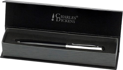 Guľôčkové pero s otočným mechanizmom a iniciálami Charles Dickens® na vrchu pera.