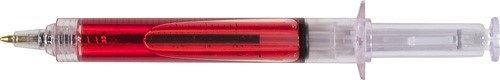 AS guľôčkové pero v tvare injekčnej striekačky s farebnou tekutinou.