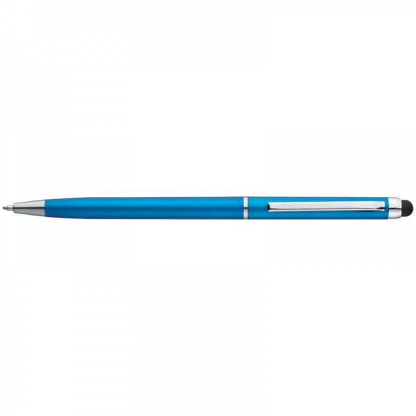 Plastové guľôčkové pero v elegantnom tenkom vyhotovení s modrou tuhou a s modernou dotykovou funkciou na ovládanie všetkých dotykových displejov.
