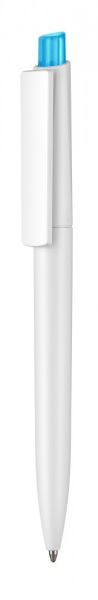 Guľôčkové pero Ritter - Crest II s bielym telom a bielym alebo farebným tlačítkom. Pero má modrý atrament.