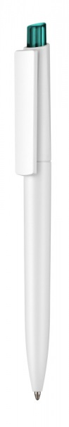 Guľôčkové pero Ritter - Crest II s bielym telom a bielym alebo farebným tlačítkom. Pero má modrý atrament.
