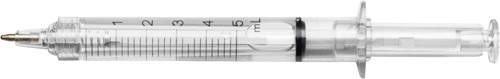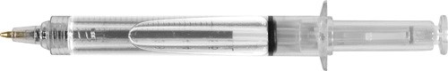 AS guľôčkové pero v tvare injekčnej striekačky s farebnou tekutinou.