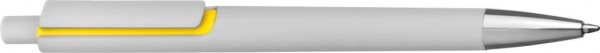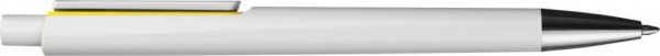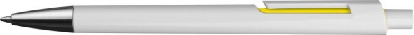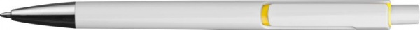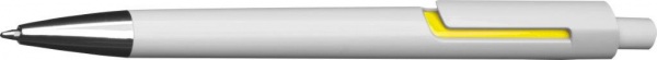 Biele plastové guľôčkové pero s farebnými časťami a jumbo náplňou. Pero má modrý atrament.
